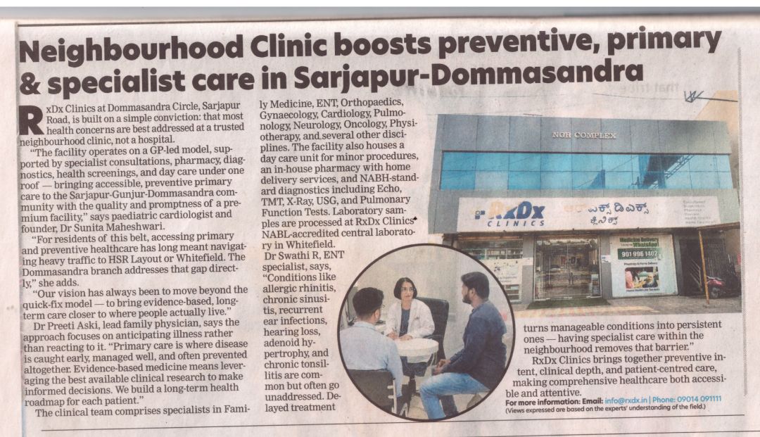 RxDx Clinics at Dommasandra Circle, Sarjapur Road, is built on a simple conviction: that most health concerns are best addressed at a trusted neighbourhood clinic, not a hospital.